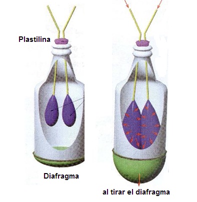 El modelo muestra como tu diafragma permite que tus pulmones respiren. La botella de plastico representa tu pecho, las pajitas son tus vias respiratorias, El globo verde representa el diafragma, y el azul son tus pulmones. Cuando el diafragma se estira y se contrae infla y desinfla tus pulmones.